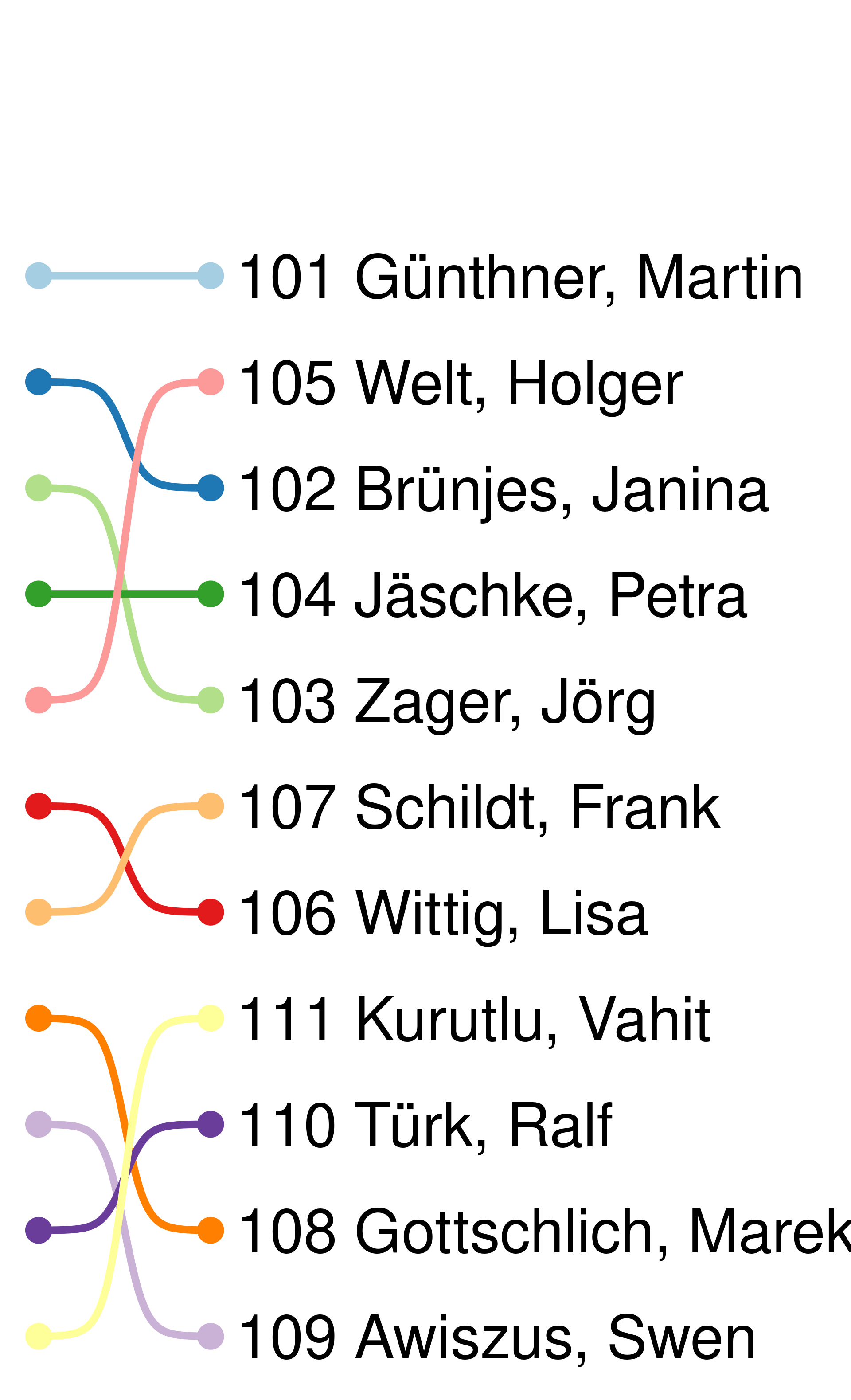 Fun-Fact (oder auch Sad-Fact): 104 Petra Jäschke wäre sowohl nur nach Personenstimmen wie auch nur nach Listenplatz gewählt. Durch die Kombination von beidem gewinnt sie kein Mandat.