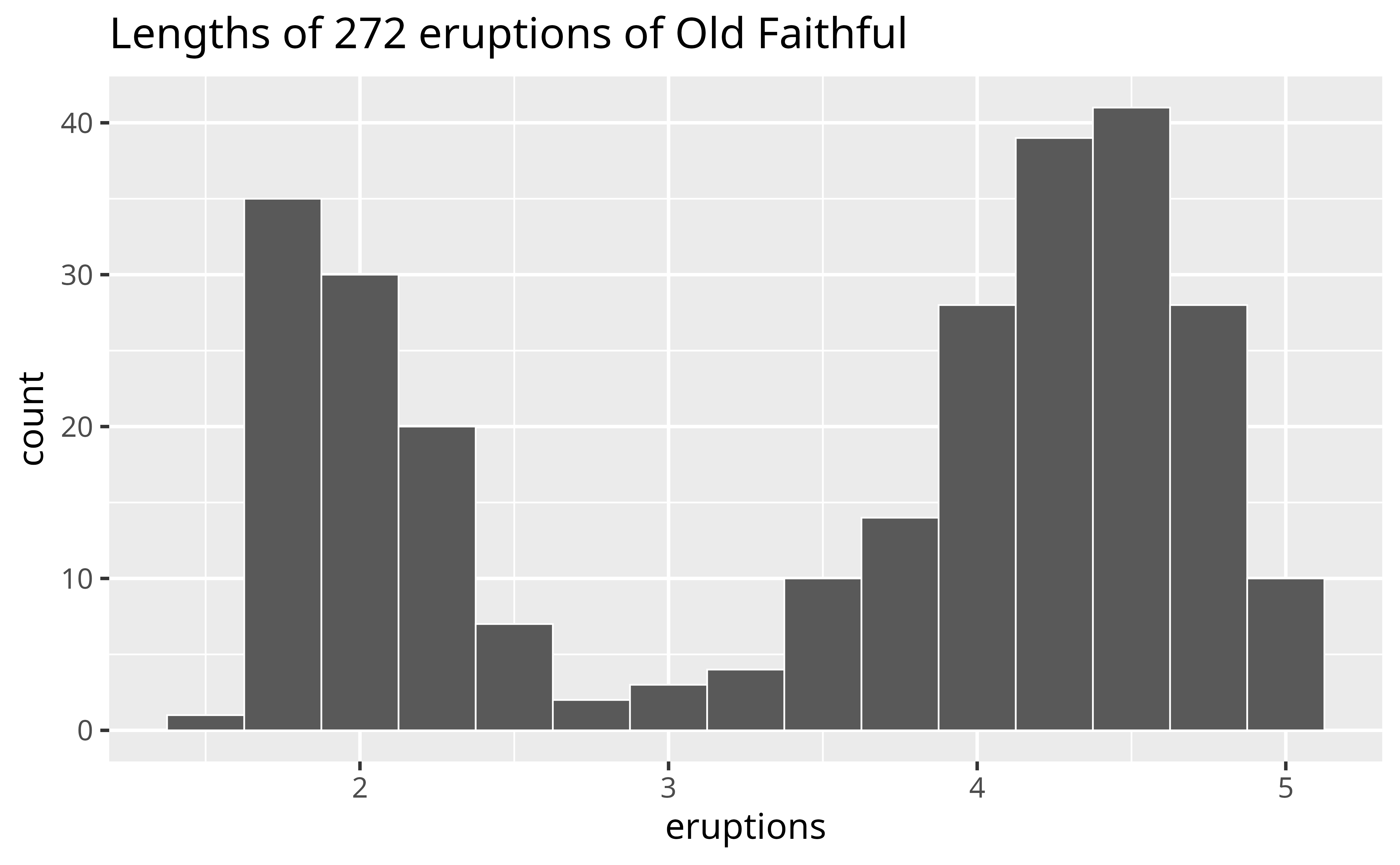 The histogram below shows the distribution of the eruptions variable in the faithful data set, which comes with R. eruptions shows the lengths (in minutes) of 272 eruptions of the Old Faithful geyser in Yellowstone National Park.
