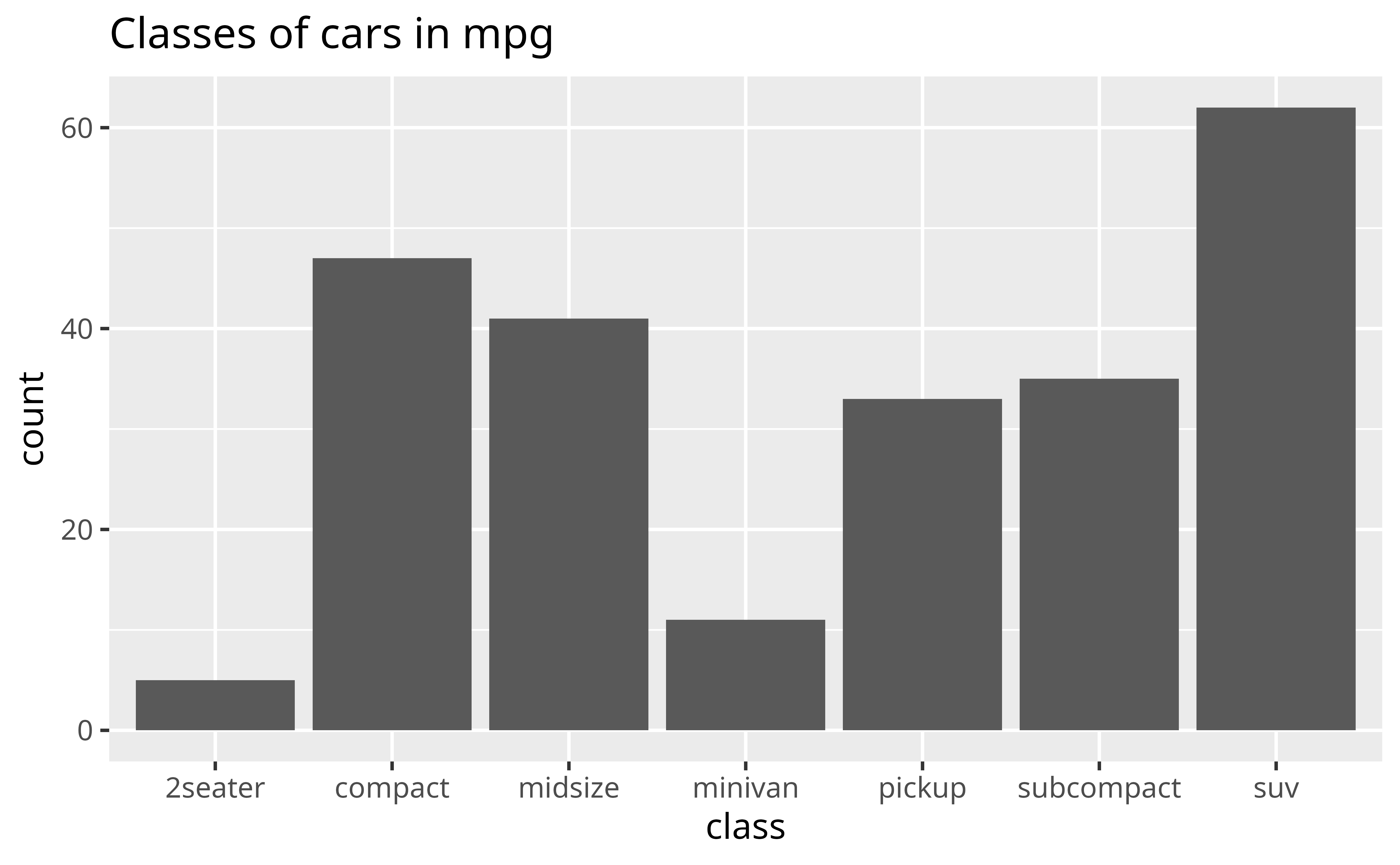 The bar chart below visualizes the distribution of the class variable in the mpg data set, which comes in the {ggplot2} package. The height of the bars reveal how many cars in the data set come from each class.