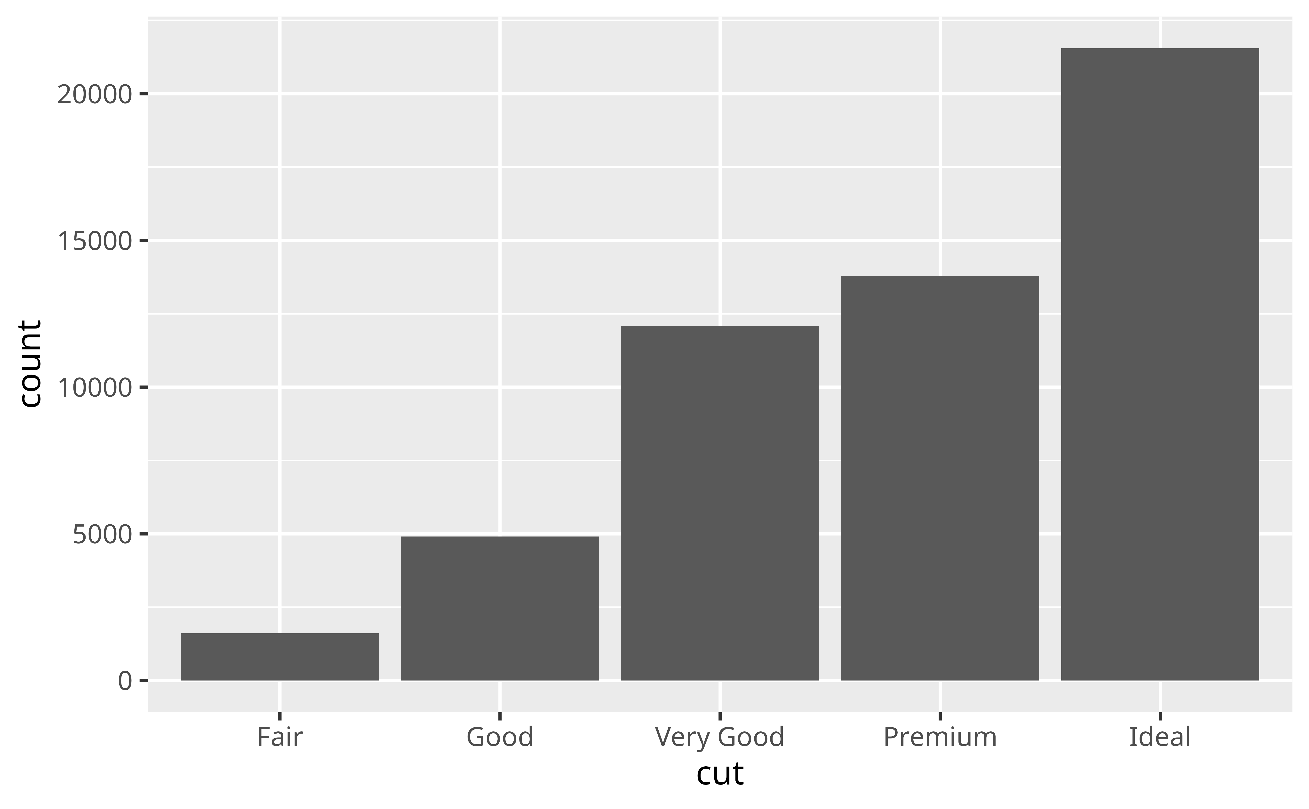 You should not supply a \(y\) aesthetic when you use geom_bar(); {ggplot2} will count how many times each \(x\) value appears in the data, and then display the counts on the \(y\) axis. So, for example, the plot above shows that over 20,000 diamonds in the data set had a value of Ideal.