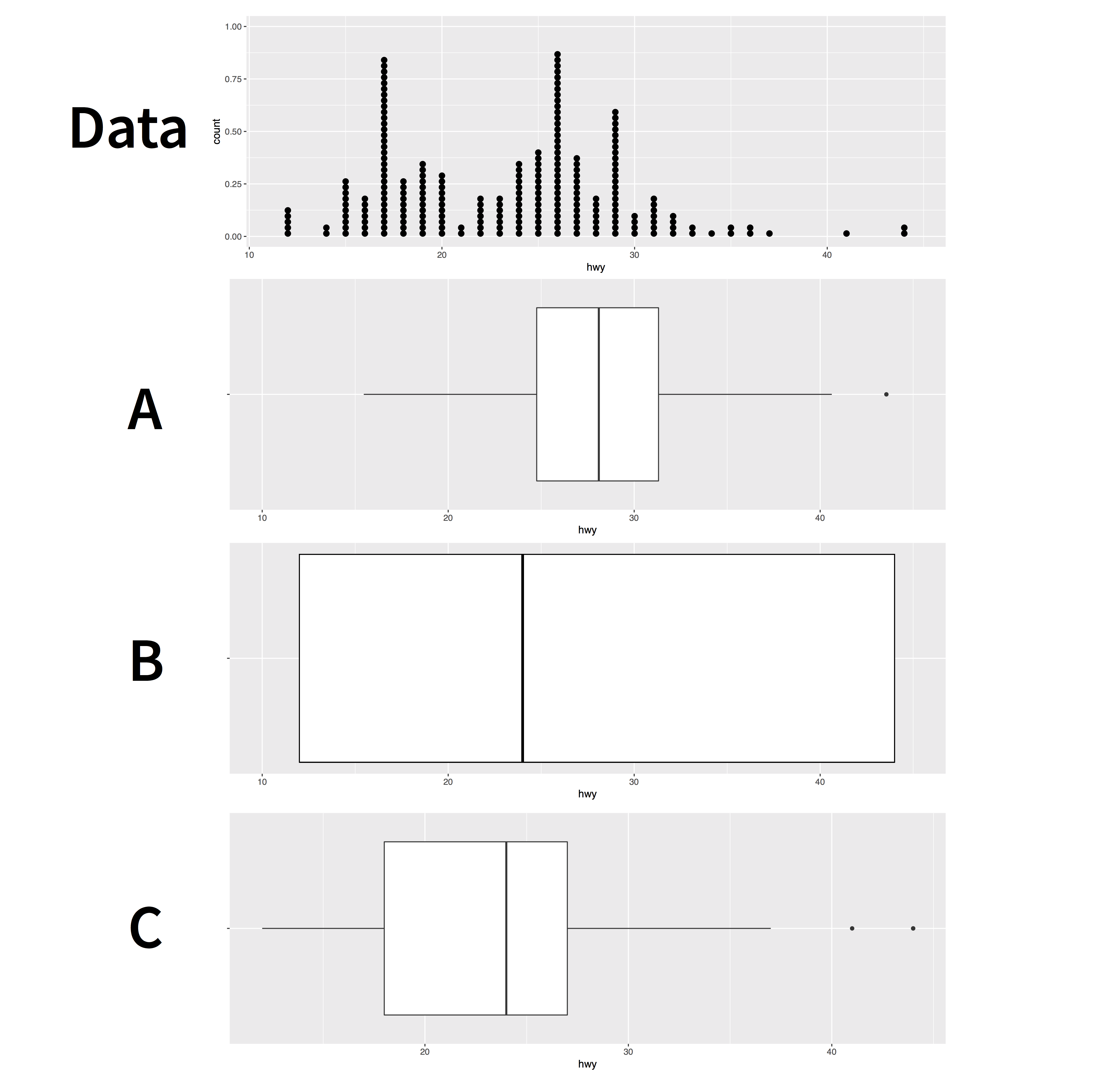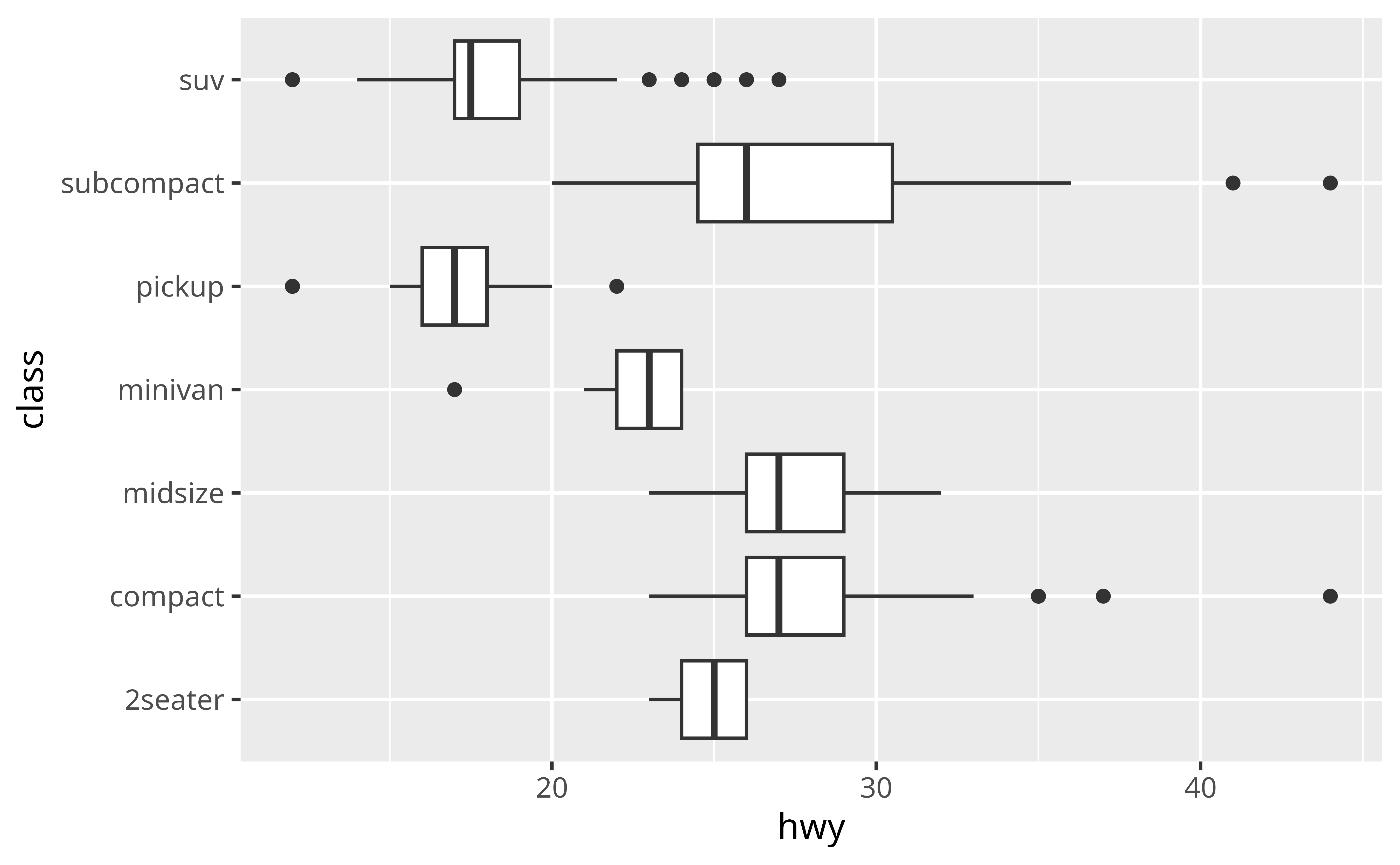 geom_boxplot() expects one x- or y-axes to the continuous and one to be categorical. For example, here class is categorical. geom_boxplot() will automatically plot a separate boxplot for each value of \(x\). This makes it easy to compare the distributions of points with different values of \(x\).