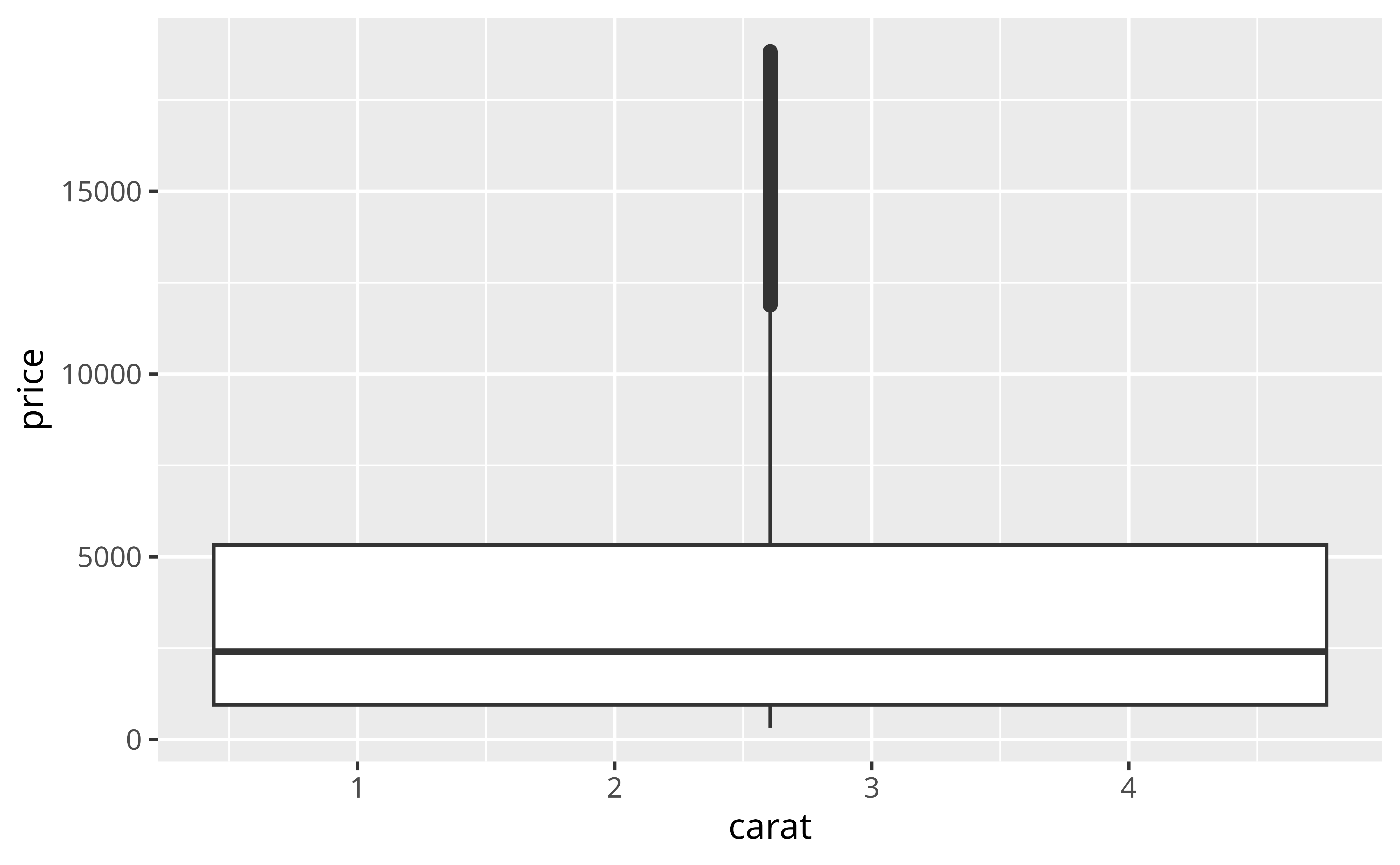 Of these group can be the most useful. Consider the plot below. It uses a continuous variable on the \(x\) axis. As a result, geom_boxplot() is not sure how to split the data into categories: it lumps all of the data into a single boxplot. The result reveals little about the relationship between carat and price.