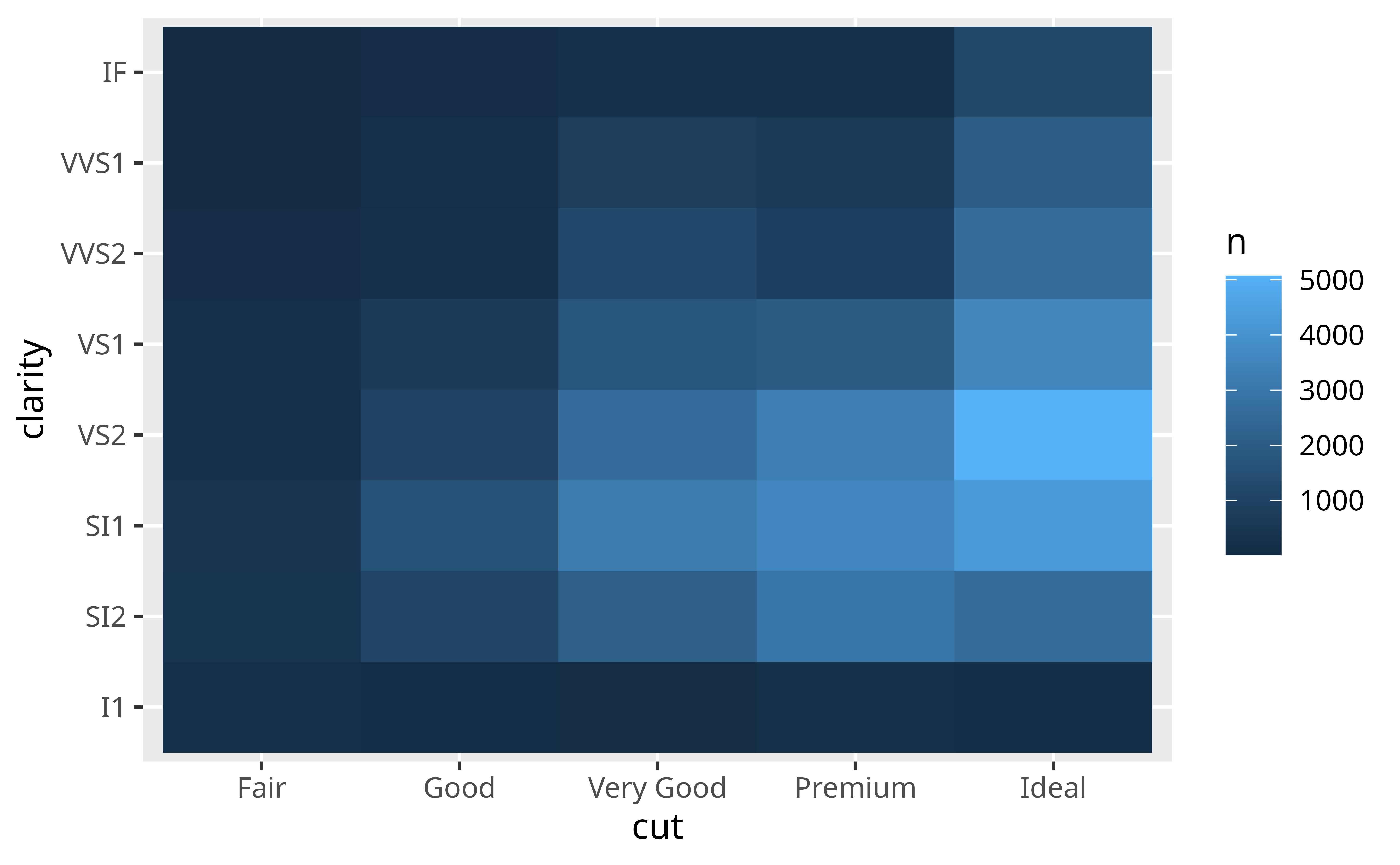 To do this, set the x and y aesthetics of geom_tile() to the variables that you pass to count(). Then map the fill aesthetic to the n variable computed by count(). The plot below displays the same counts as the plot in Exercise 8.