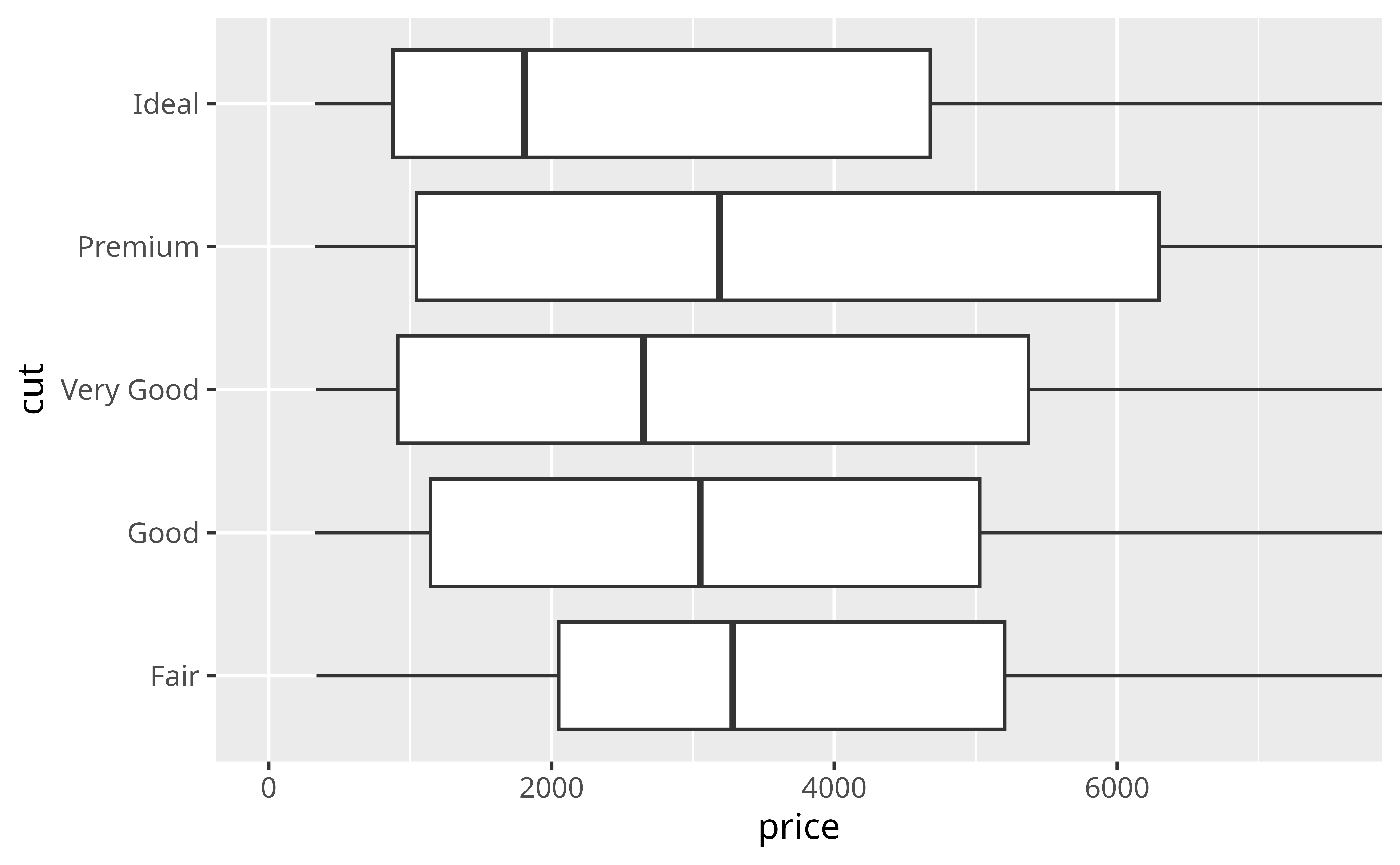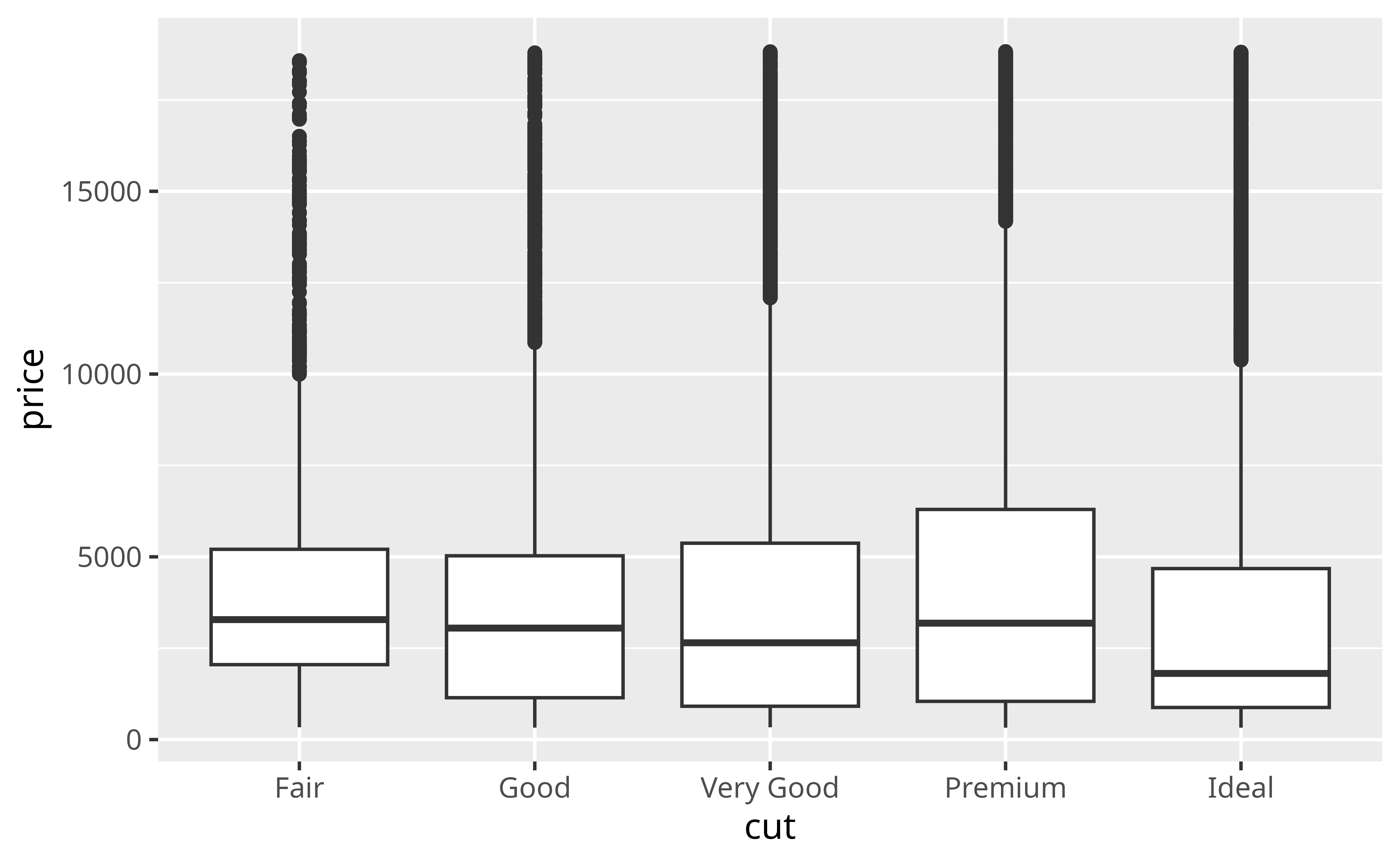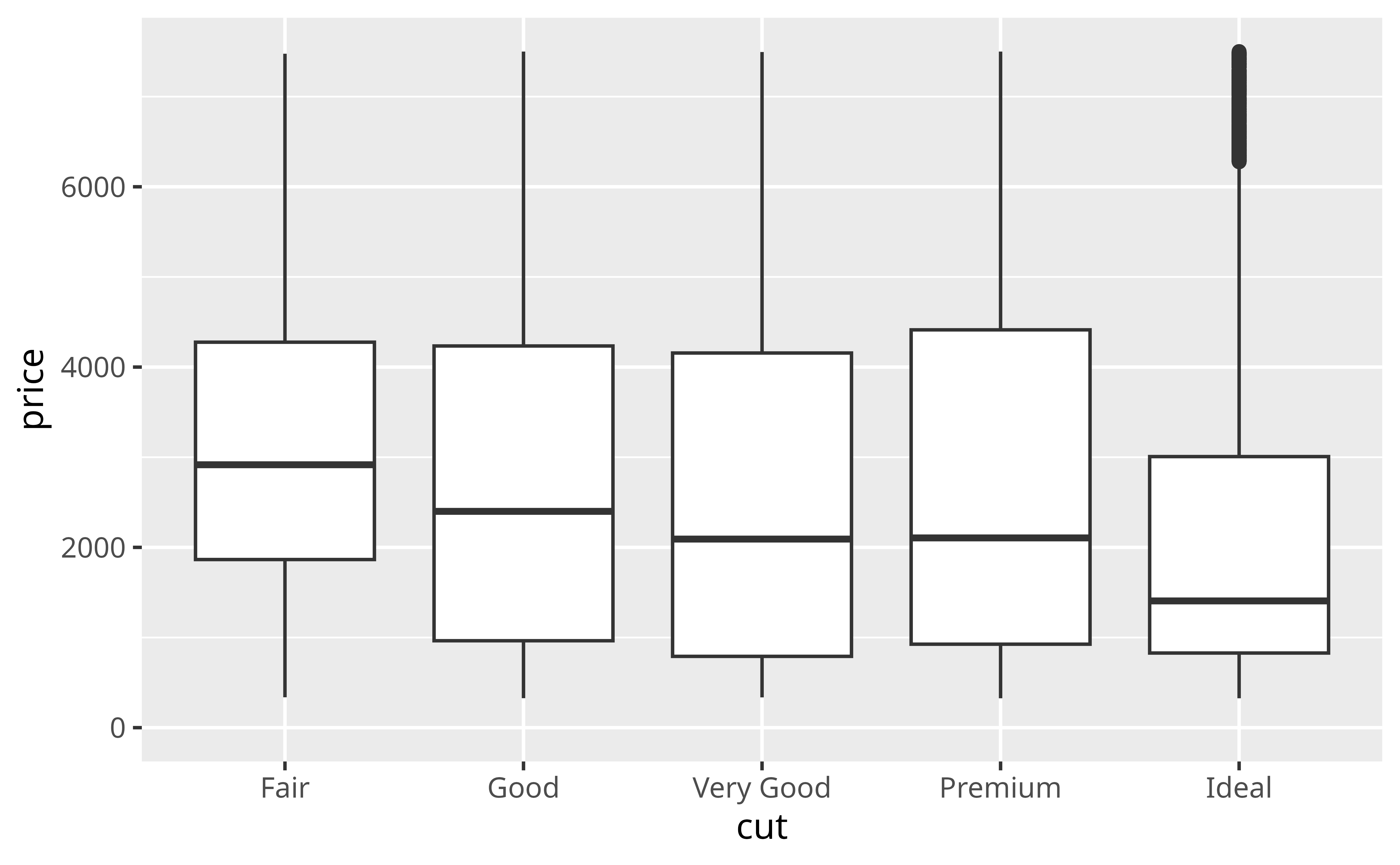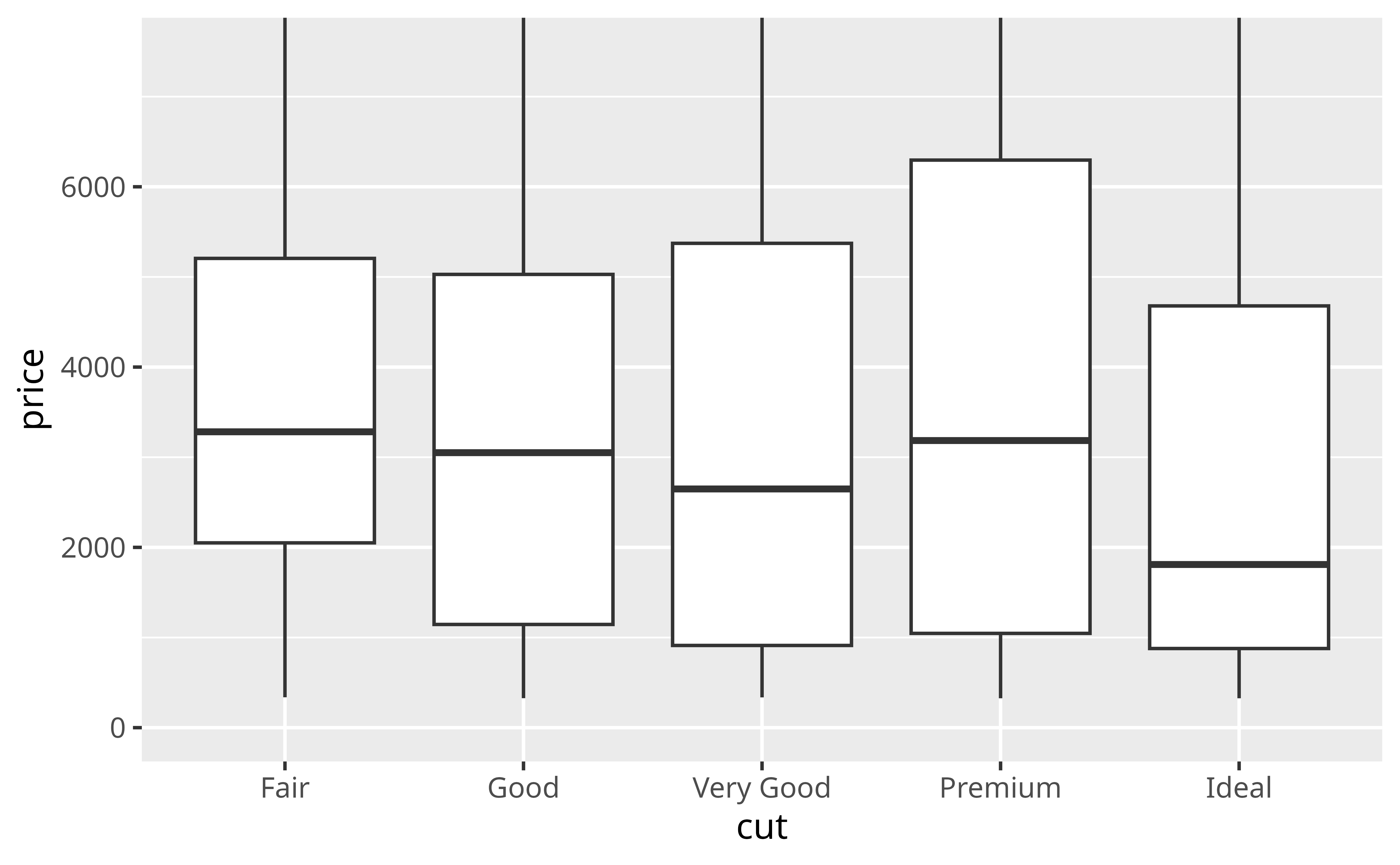 Our plot shows something surprising: when you group diamonds by cut, the worst cut diamonds have the highest median price. It’s a little hard to see in the plot, but you can verify it with some data manipulation.